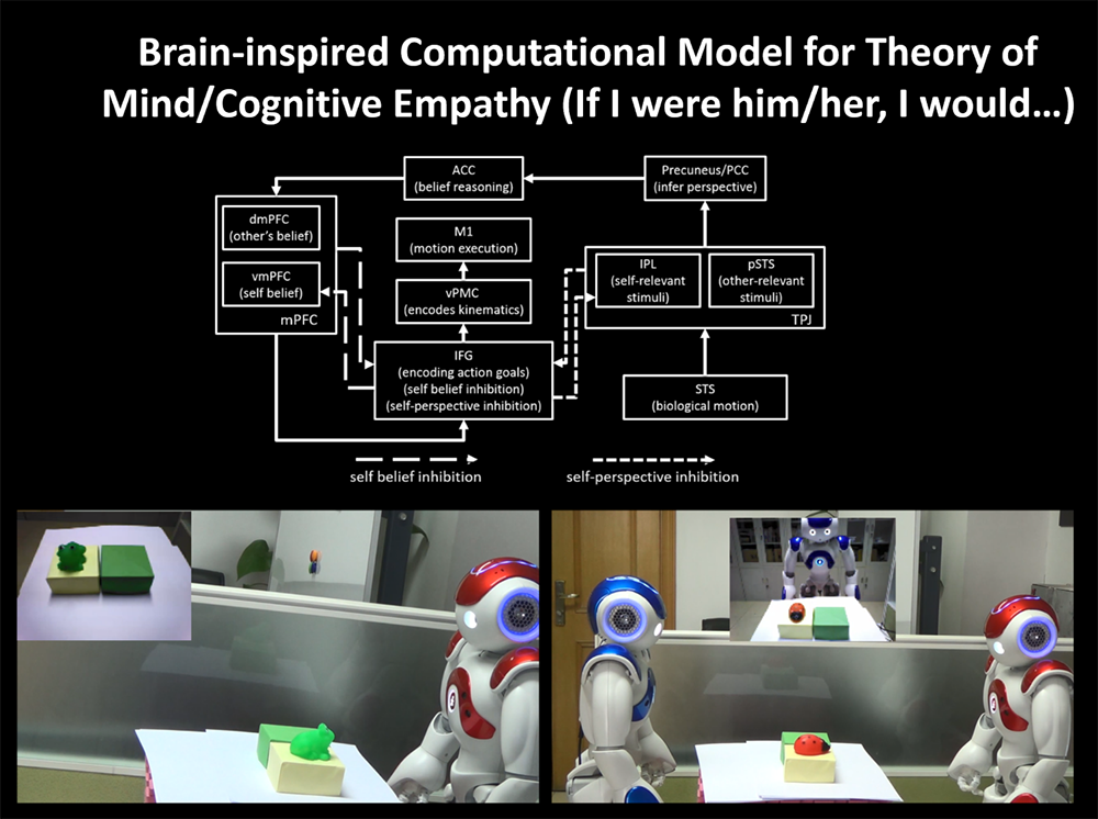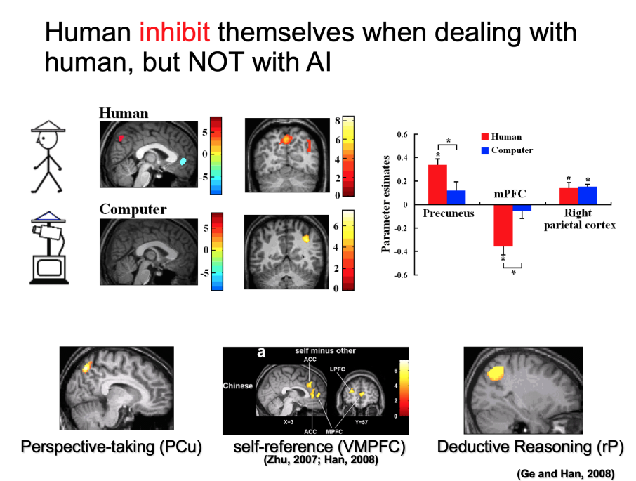 当人们使用功能磁共振成像扫描(fMRI)对大脑进行扫描会发现,被试只有在观看人类(而非机器,卡通或动物)时,拥有“读心功能(mind-reading)”的大脑MPFC区域才会被激活。由此启发,在她与同事于2008年进行的实验区分了Mental Inference (MI),Deductive Reasoning (DR),Perspective Taking (PT) 和Perception (PC) 四种功能,对比被试在理解人和机器时大脑的活动差异,发现人类大脑会在处理与他人相关的事情时自我抑制(inhibit),同样的活动却不会发生在处理与AI相关的事情上。就个人差异来看,拥有更高的PT和自我抑制(self-inhibition)能力的人更能高效地理解他人,但这样的能力在理解AI时并不重要。
